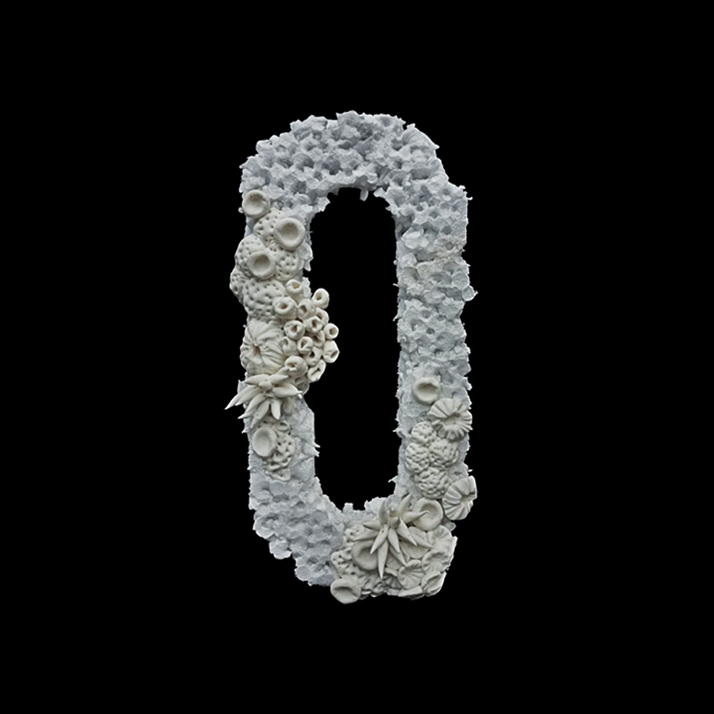 The typeface begins with letters resembling broken coral, mirroring damage seen on the beach. As the alphabet progresses, the forms slowly come back to life.